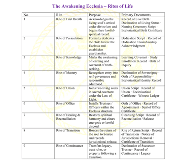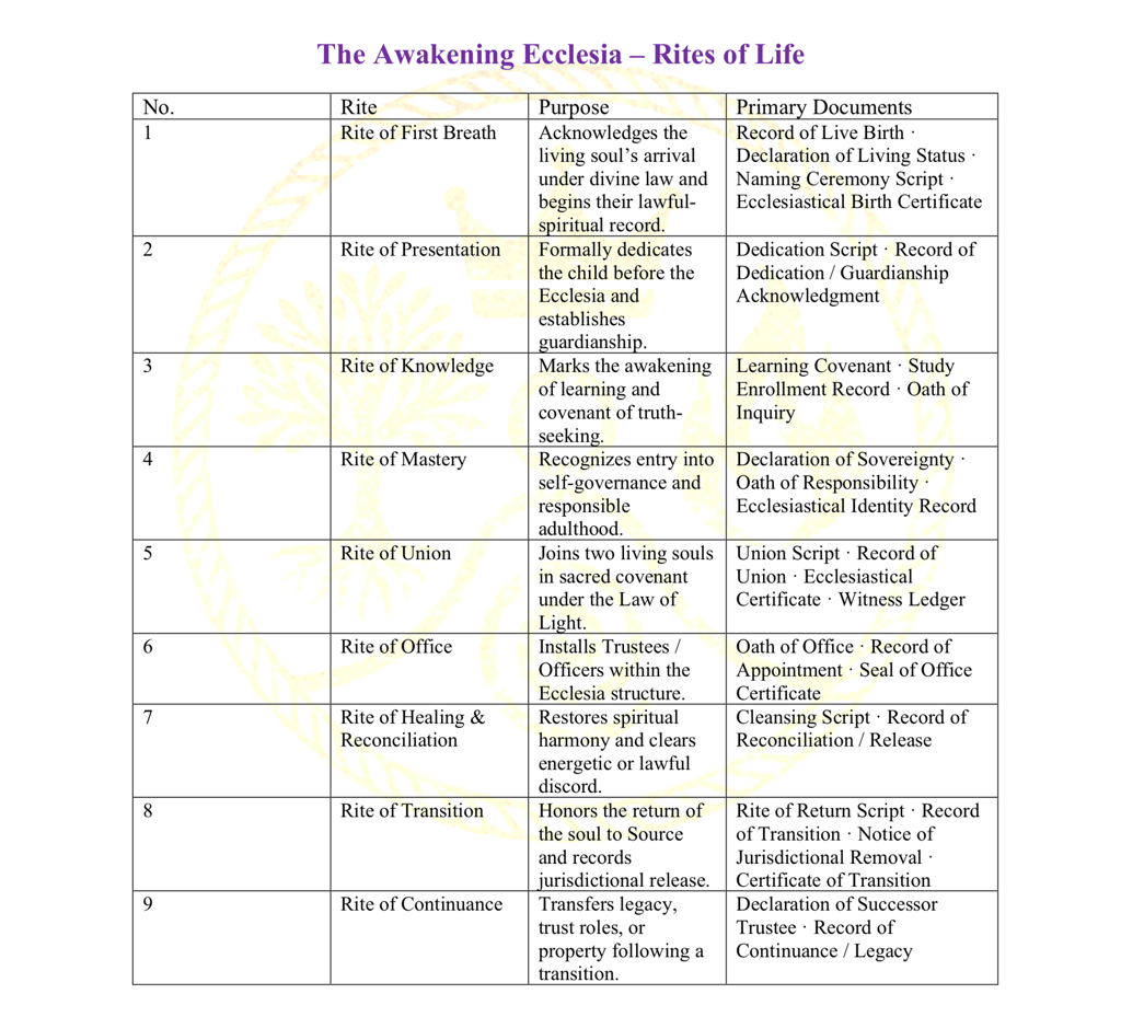 This index enumerates the recognized ecclesiastical rites of The Awakening Ecclesia and identifies the corresponding records preserved under private ecclesiastical authority and trust custody.